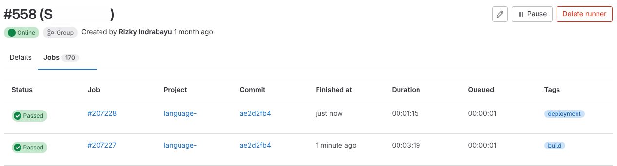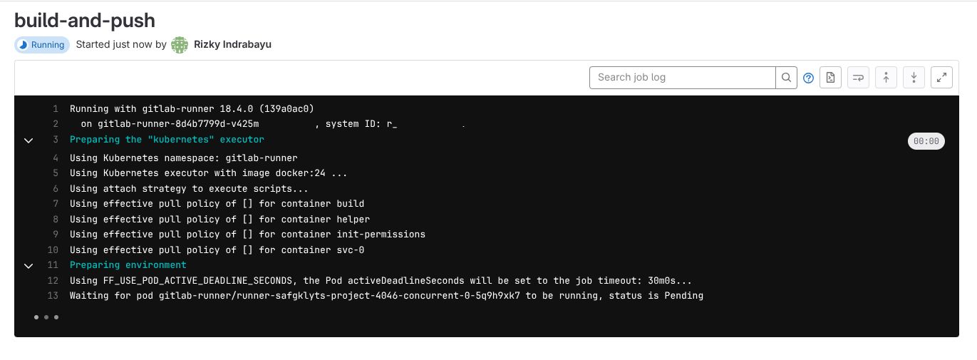 Navigate to your GitLab project -> CI/CD -> Pipelines to monitor the pipeline execution. Below is the example of Running (blue indicator) jobs on build tags. The Gitlab Runner waiting for our Kubernetes pods to be running for build-and-push stage.